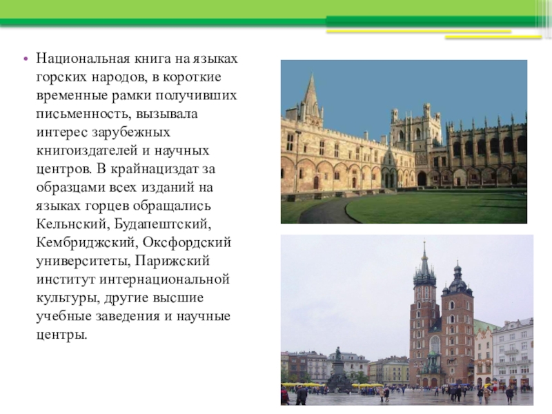 письменность, вызывала интерес зарубежных книгоиздателей и научных центров. В крайнациздат за образцами всех изданий на языках горцев обращались Кельнский, Будапештский, Кембриджский, Оксфордский университеты, Парижский институт интернациональной культуры, другие высшие учебные заведения и научные центры.