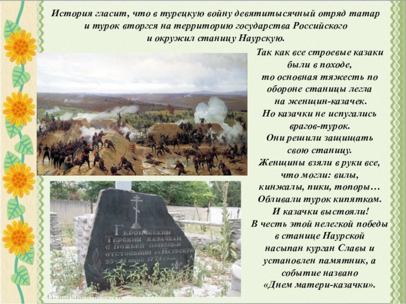 История гласит, что в турецкую войну девятитысячный отряд татар и турок вторгся на территорию государства Российского