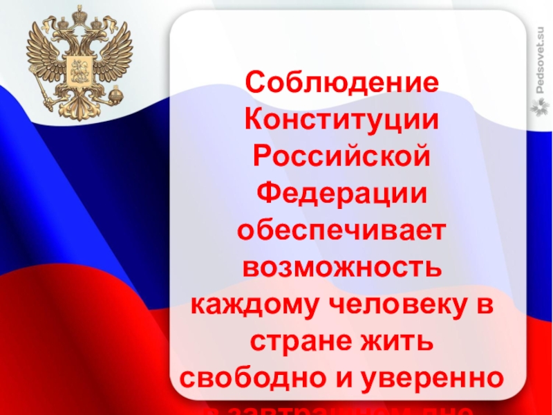 Слайд 17Соблюдение Конституции Российской Федерации обеспечивает возможность каждому человеку в стране жить
