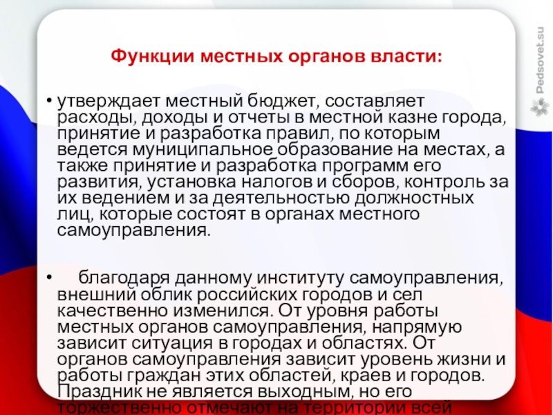 благодаря данному институту самоуправления, внешний облик российских городов и сел качественно изменился. От уровня работы местных органов самоуправления, напрямую зависит ситуация в городах и областях. От органов самоуправления зависит уровень жизни и работы граждан этих областей, краев и городов. Праздник не является выходным, но его торжественно отмечают на территории всей Российской Федерации.