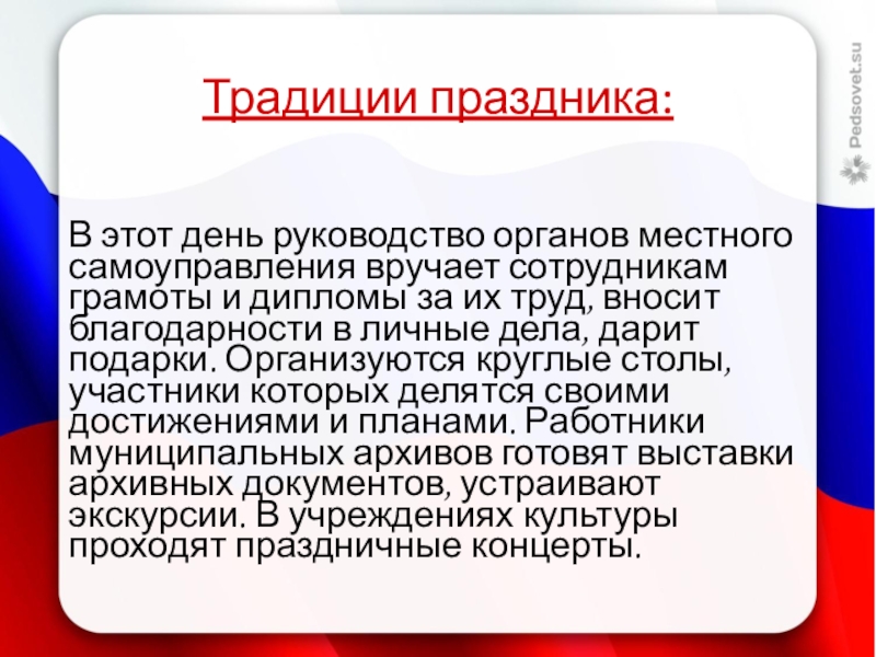 и дипломы за их труд, вносит благодарности в личные дела, дарит подарки. Организуются круглые столы, участники которых делятся своими достижениями и планами. Работники муниципальных архивов готовят выставки архивных документов, устраивают экскурсии. В учреждениях культуры проходят праздничные концерты.