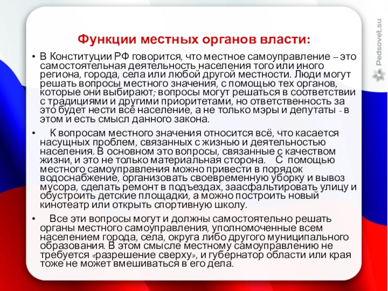 К вопросам местного значения относится всё, что касается насущных проблем, связанных с жизнью и деятельностью населения. В основном это вопросы, связанные с качеством жизни, и это не только материальная сторона. С помощью местного самоуправления можно привести в порядок водоснабжение, организовать своевременную уборку и вывоз мусора, сделать ремонт в подъездах, заасфальтировать улицу и обустроить детские площадки, а можно построить новый кинотеатр или открыть спортивную школу.