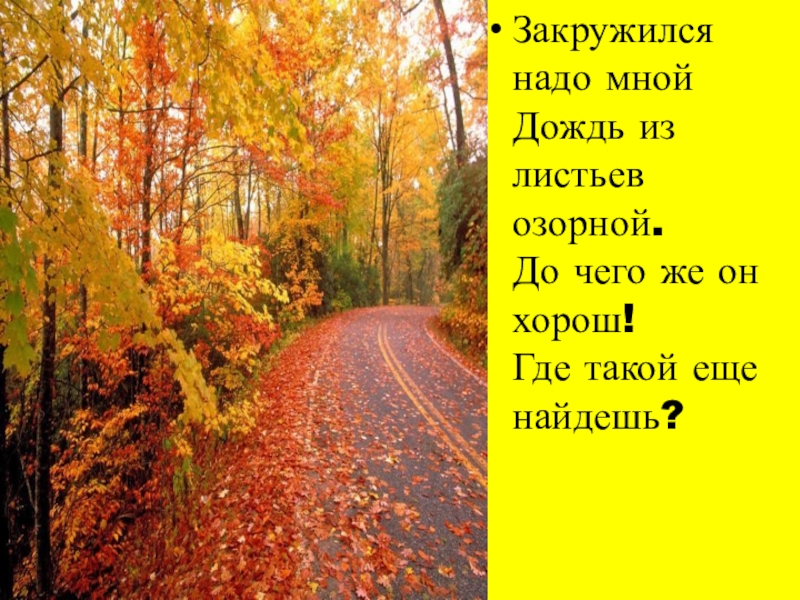 Слайд 11Закружился надо мной Дождь из листьев озорной. До чего же он хорош! Где такой