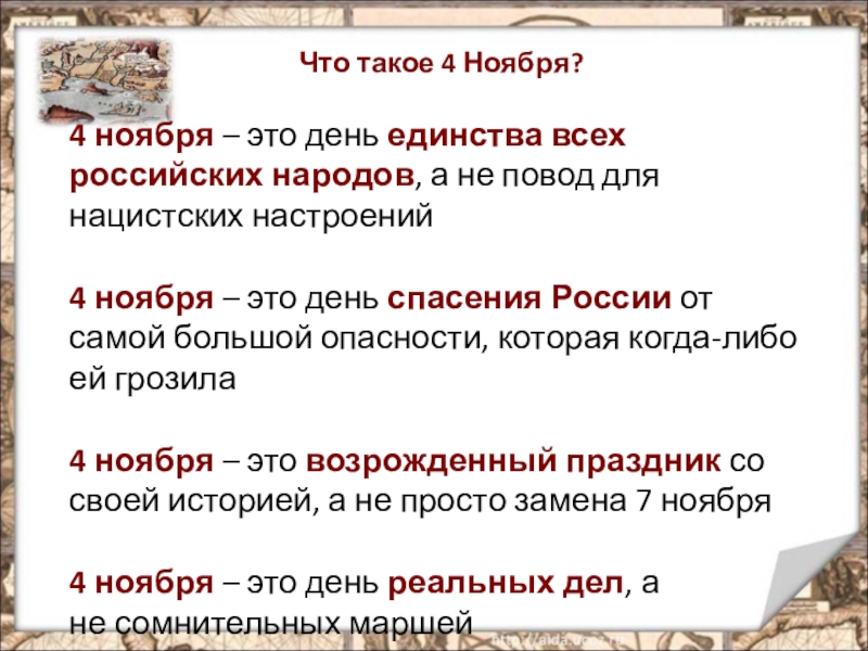 народов, а не повод для нацистских настроений   4 ноября – это день спасения России от самой большой опасности, которая когда-либо ей грозила   4 ноября – это возрожденный праздник со своей историей, а не просто замена 7 ноября   4 ноября – это день реальных дел, а не сомнительных маршей