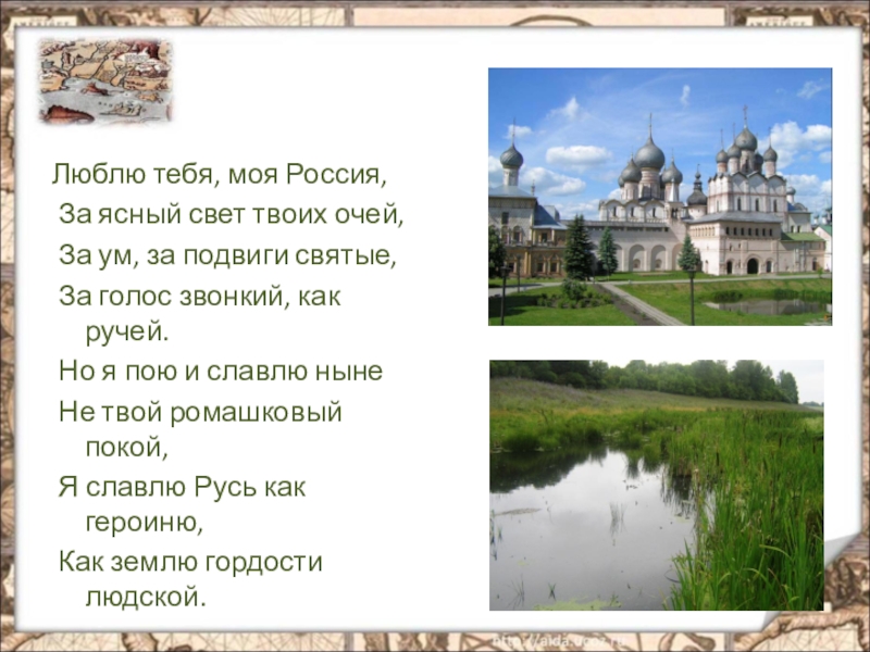 Люблю тебя, моя Россия, За ясный свет твоих очей, За ум, за подвиги святые, За голос звонкий,