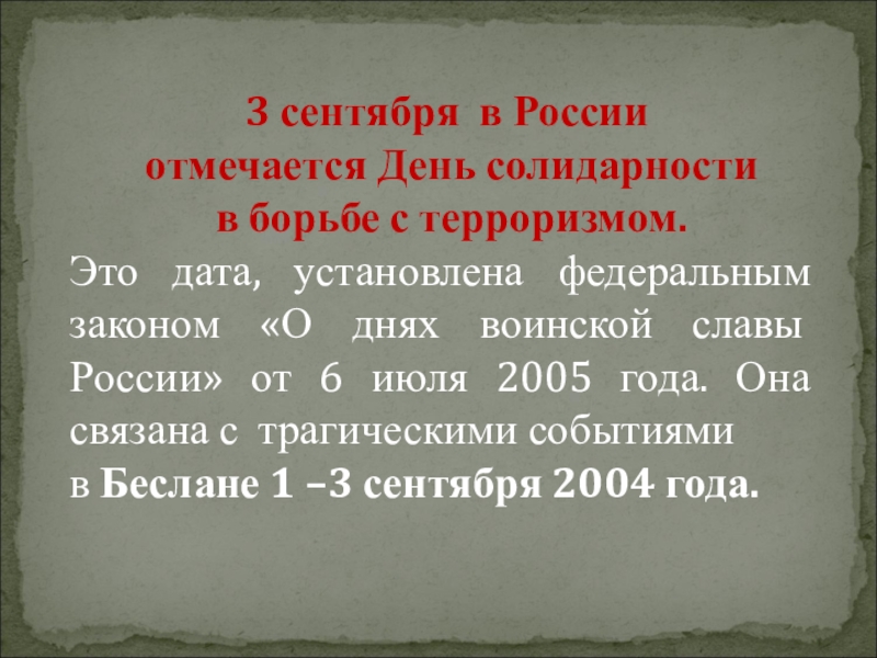дата, установлена федеральным законом «О днях воинской славы России» от 6 июля 2005 года. Она связана с трагическими событиями