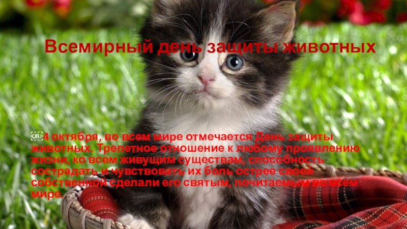 Всемирный день защиты животных4 октября, во всем мире отмечается День защиты животных. Трепетное отношение к любому проявлению жизни, ко всем живущим существам, способность сострадать и чувствовать их боль острее своей собственной сделали его святым, почитаемым во