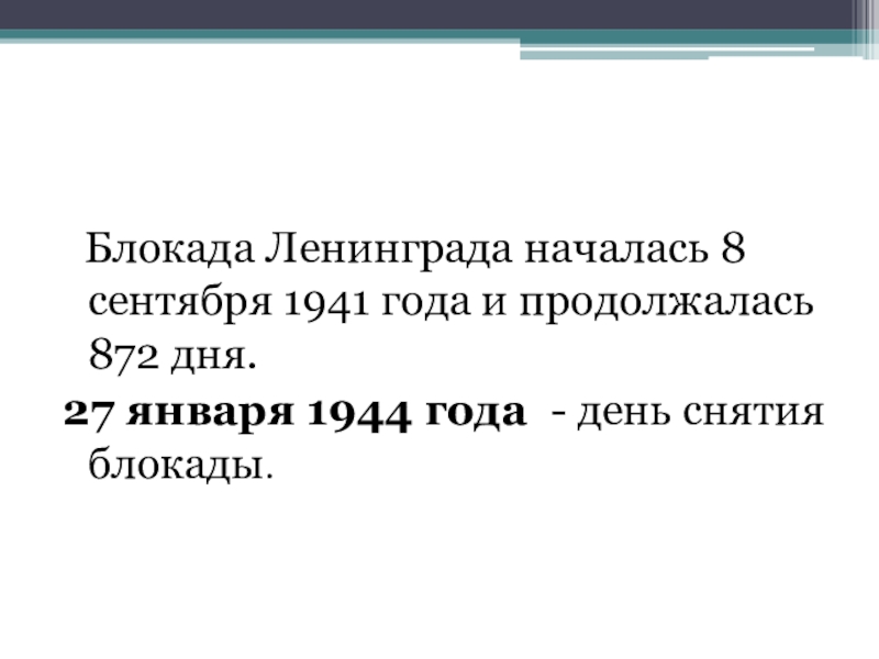 Блокада Ленинграда началась 8 сентября 1941 года и продолжалась 872 дня. 27 января 1944 года - день снятия блокады.