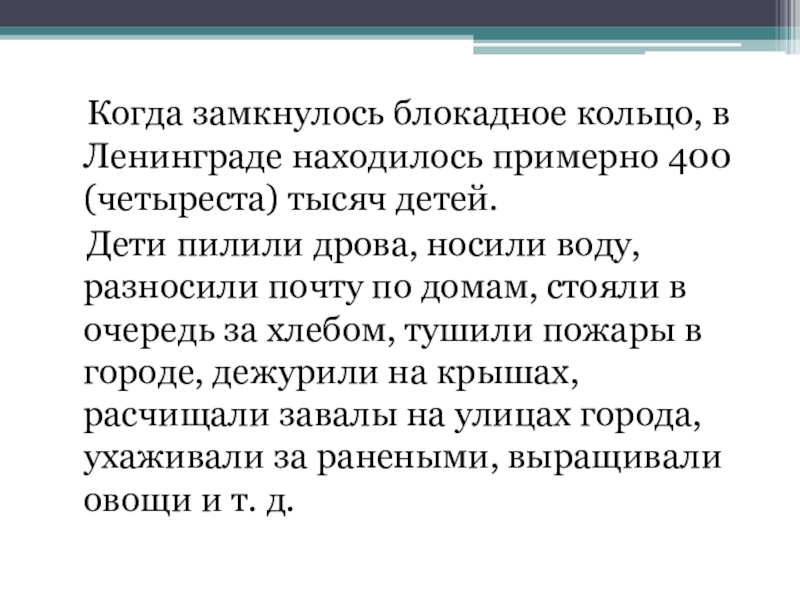 Когда замкнулось блокадное кольцо, в Ленинграде находилось примерно 400 (четыреста) тысяч детей.  Дети