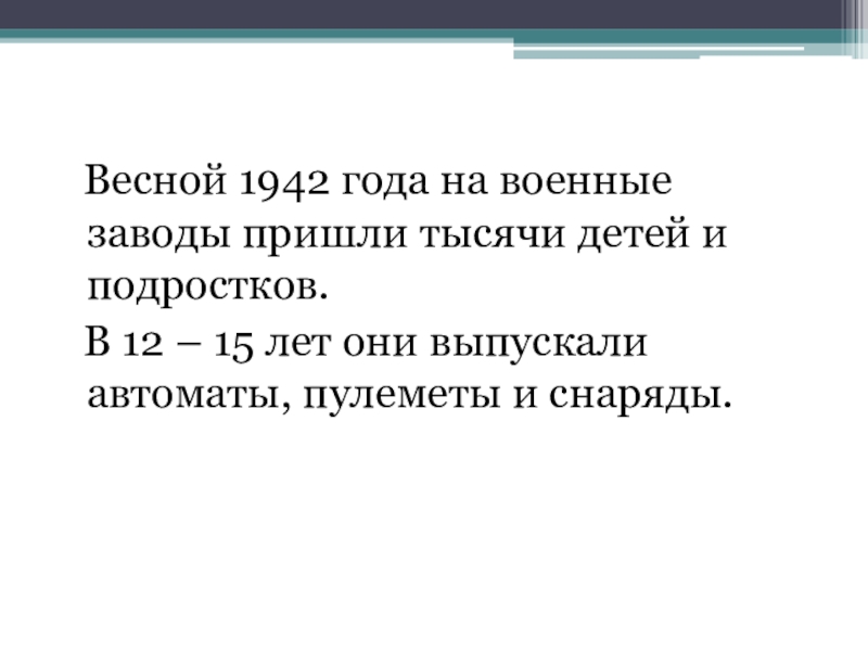 Весной 1942 года на военные заводы пришли тысячи детей и подростков. В 12 – 15 лет