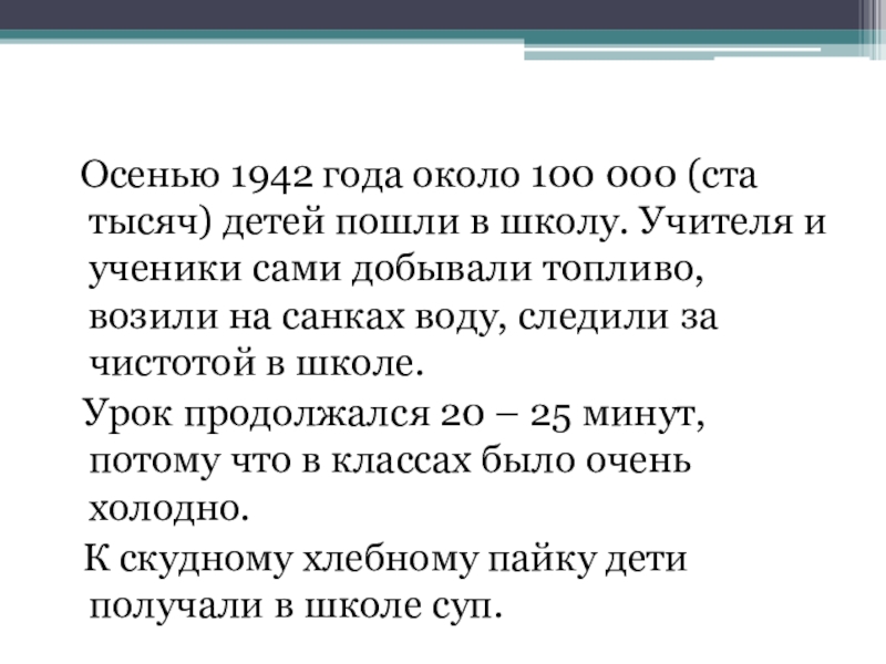 Осенью 1942 года около 100 000 (ста тысяч) детей пошли в школу. Учителя и ученики сами