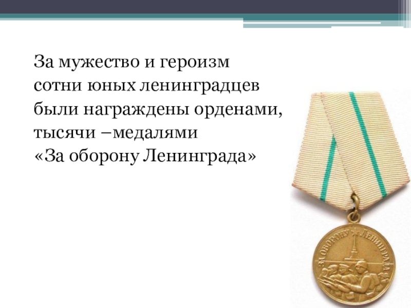 За мужество и героизм сотни юных ленинградцев были награждены орденами, тысячи –медалями «За оборону Ленинграда»