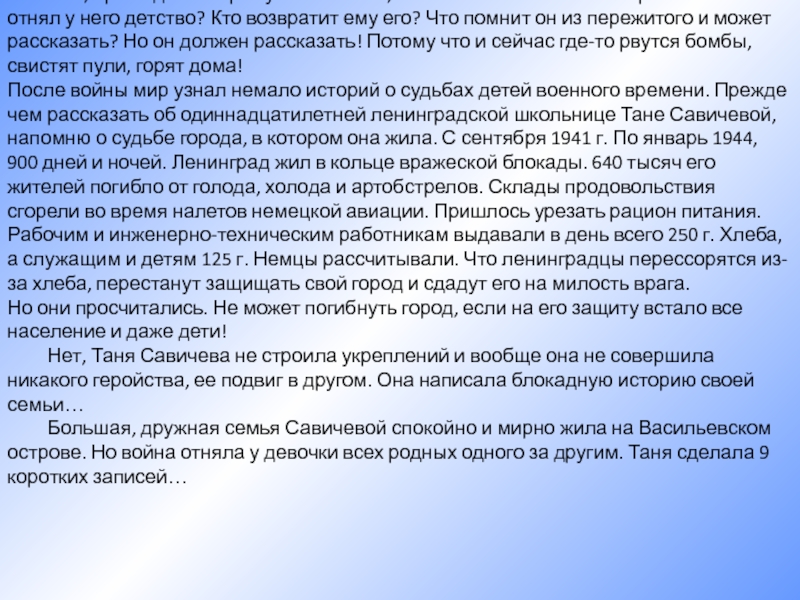 В крепости не хватало воды, её делили по глотку. Пить хотелось мучительно, но Валя снова и снова отказывалась от своего глотка: вода нужна раненым. Когда командование Брестской крепости приняло решение вывести детей и женщин из-под огня, переправить на другой берег реки Мухавец - иной возможности спасти их жизнь не было, - маленькая санитарка Валя Зенкина просила оставить её с бойцами. Но приказ есть приказ, и тогда она поклялась продолжить борьбу с врагом до полной победы.