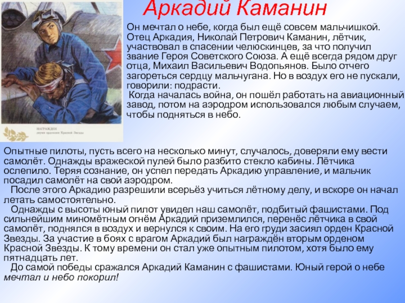 До самой победы сражался Аркадий Каманин с фашистами. Юный герой о небе мечтал и небо покорил!
