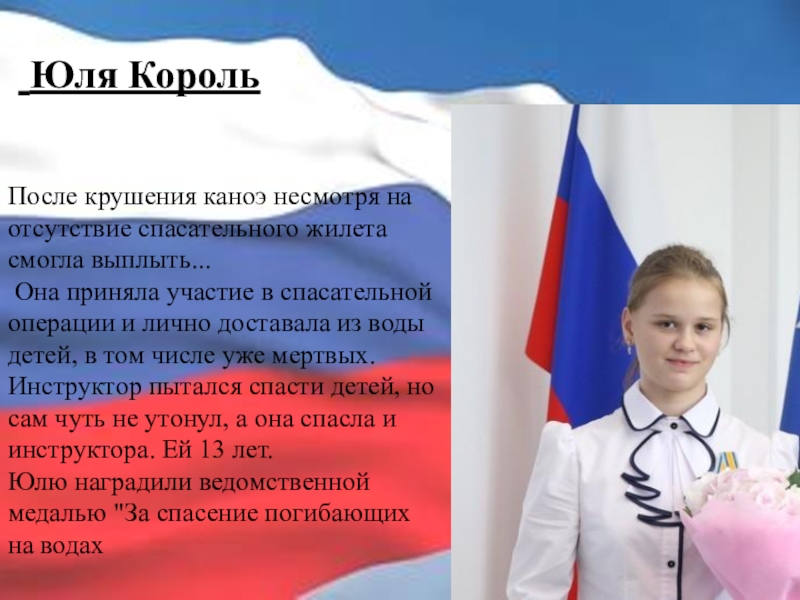 Она приняла участие в спасательной операции и лично доставала из воды детей, в том числе уже мертвых. Инструктор пытался спасти детей, но сам чуть не утонул, а она спасла и инструктора. Ей 13 лет.