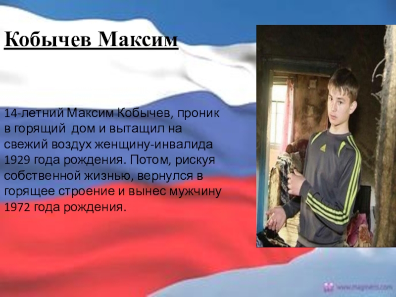 14-летний Максим Кобычев, проник в горящий дом и вытащил на