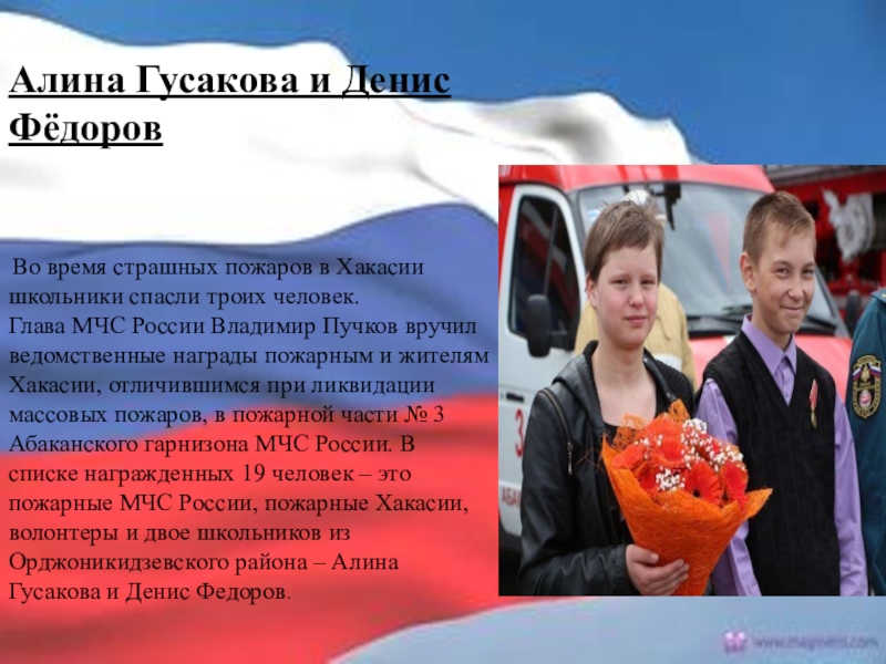 Глава МЧС России Владимир Пучков вручил ведомственные награды пожарным и жителям Хакасии, отличившимся при ликвидации массовых пожаров, в пожарной части № 3 Абаканского гарнизона МЧС России. В списке награжденных 19 человек – это пожарные МЧС России, пожарные Хакасии, волонтеры и двое школьников из Орджоникидзевского района – Алина Гусакова и Денис Федоров.