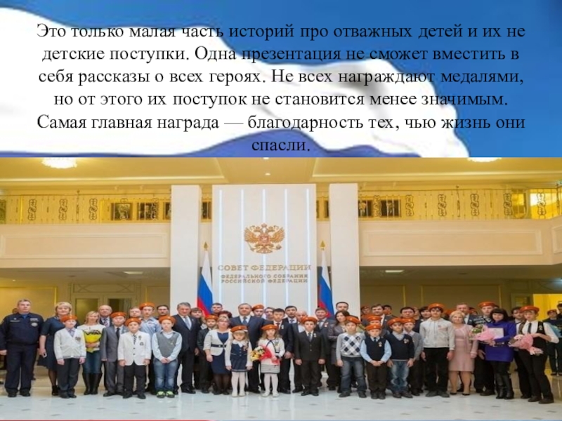 детские поступки. Одна презентация не сможет вместить в себя рассказы о всех героях. Не всех награждают медалями, но от этого их поступок не становится менее значимым. Самая главная награда — благодарность тех, чью жизнь они спасли.