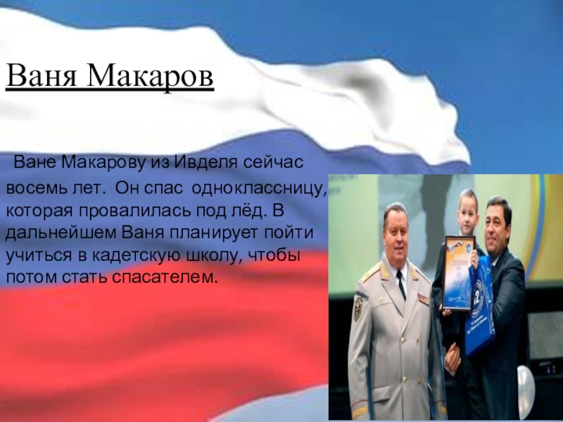 одноклассницу, которая провалилась под лёд. В дальнейшем Ваня планирует пойти учиться в кадетскую школу, чтобы потом стать спасателем.