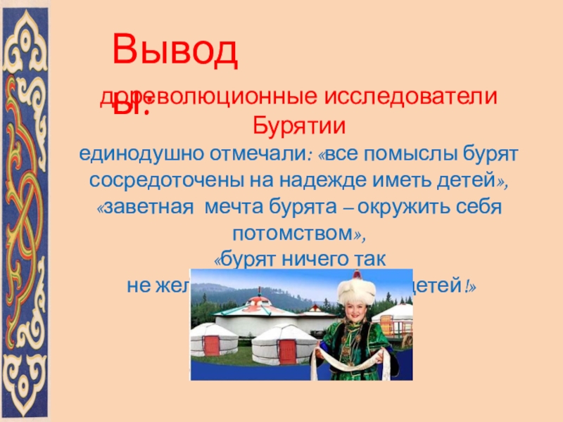 Выводы:дореволюционные исследователи Бурятии единодушно отмечали: «все помыслы бурят сосредоточены на надежде иметь детей», «заветная мечта бурята –