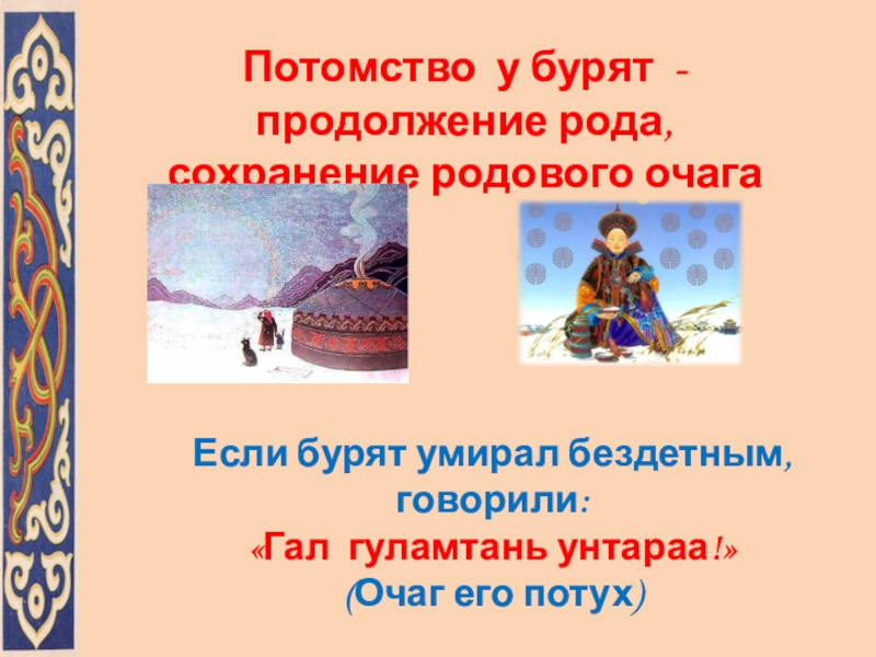 Потомство у бурят - продолжение рода, сохранение родового очагаЕсли бурят умирал бездетным, говорили: «Гал гуламтань унтараа!»(Очаг его