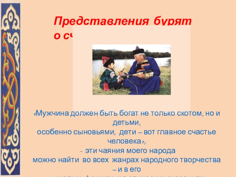 Представления бурят о счастье«Мужчина должен быть богат не только скотом, но и детьми, особенно сыновьями, дети –