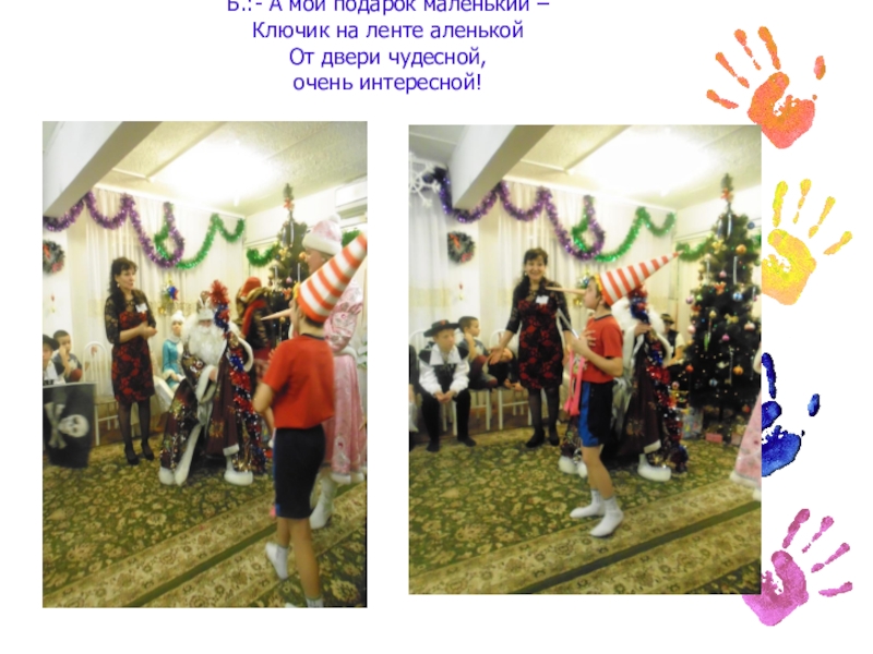 Слайд 9Б.:- А мой подарок маленький – Ключик на ленте аленькой От двери чудесной, очень