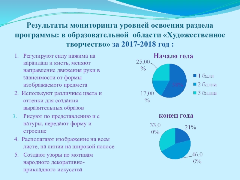 Слайд 14Результаты мониторинга уровней освоения раздела программы: в образовательной области «Художественное творчество»
