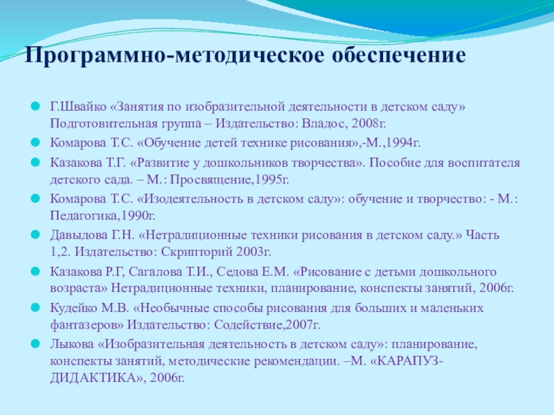 Казакова Т.Г. «Развитие у дошкольников творчества». Пособие для воспитателя детского сада. – М.: Просвящение,1995г.