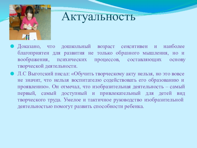Л.С Выготский писал: «Обучить творческому акту нельзя, но это вовсе не значит, что нельзя воспитателю содействовать его образованию и проявлению». Он отмечал, что изобразительная деятельность – самый первый, самый доступный и привлекательный для детей вид творческого труда. Умелое и тактичное руководство изобразительной деятельностью помогут развить способности ребенка.