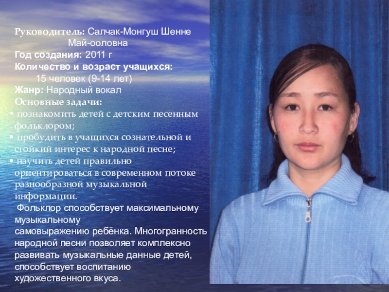 Руководитель: Салчак-Монгуш Шенне Май-ооловнаГод создания: 2011 гКоличество и возраст учащихся: 15 человек (9-14 лет)Жанр: Народный вокалОсновные задачи: познакомить детей с детским песенным фольклором; пробудить
