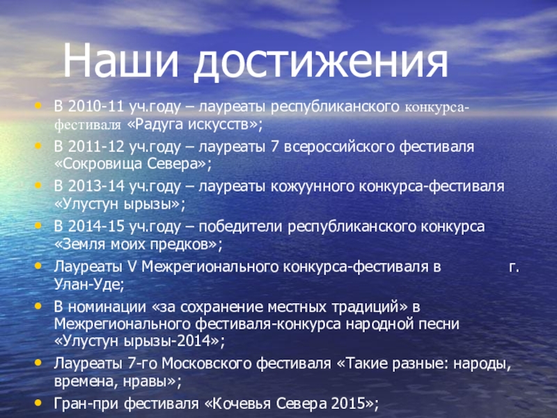 Наши достиженияВ 2010-11 уч.году – лауреаты республиканского конкурса-фестиваля «Радуга искусств»;В 2011-12 уч.году – лауреаты 7 всероссийского