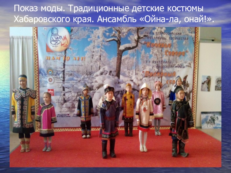 Слайд 19Показ моды. Традиционные детские костюмы Хабаровского края. Ансамбль «Ойна-ла, онай!».