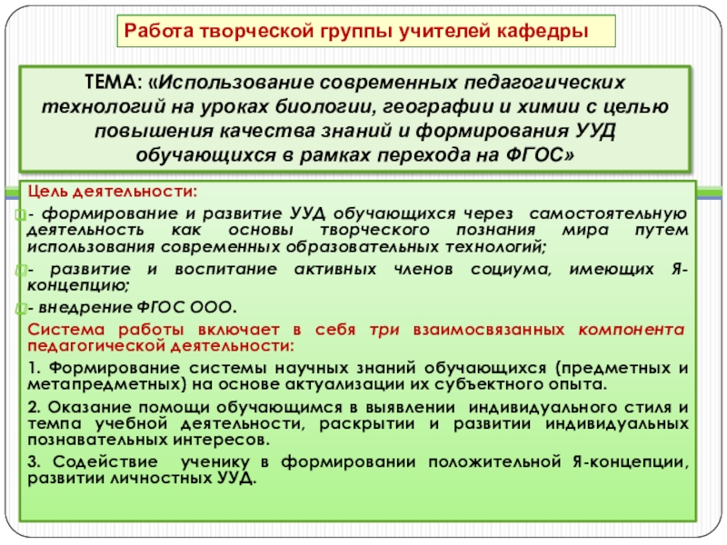 ТЕМА: «Использование современных педагогических технологий на уроках биологии, географии и химии с целью повышения качества знаний и формирования УУД обучающихся в рамках перехода на ФГОС»