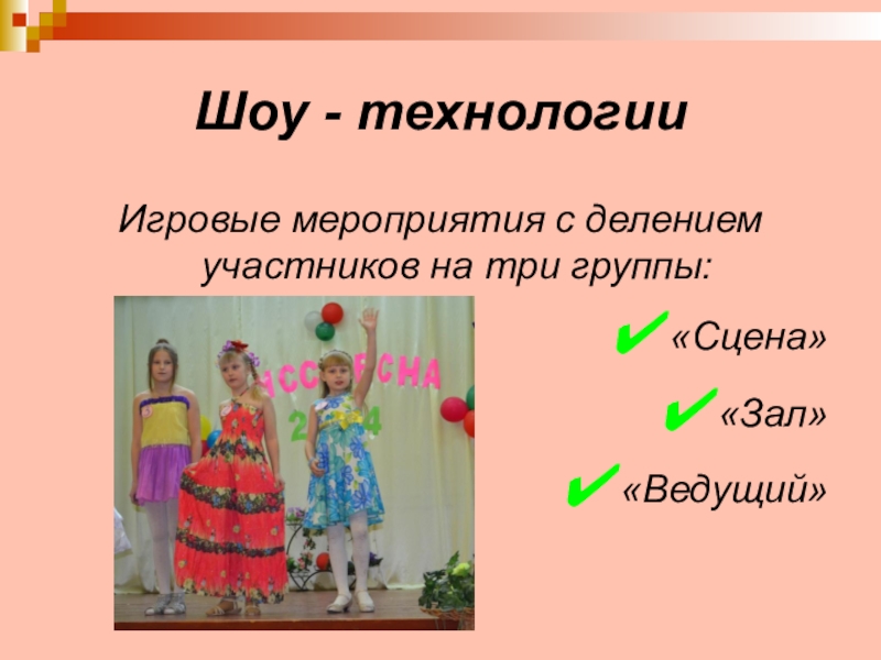 Шоу - технологииИгровые мероприятия с делением участников на три группы:«Сцена»«Зал»«Ведущий»
