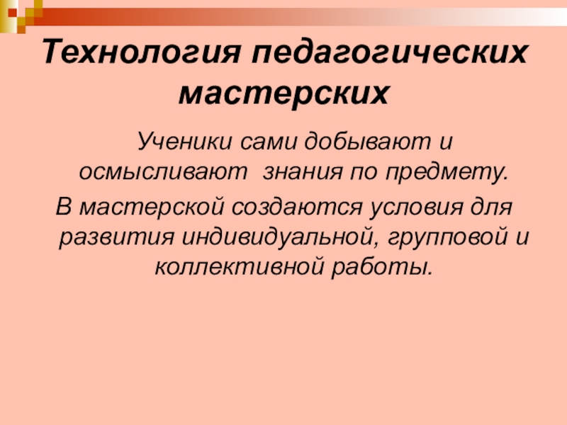 Технология педагогических мастерских  Ученики сами добывают и осмысливают знания по предмету. В мастерской создаются условия для