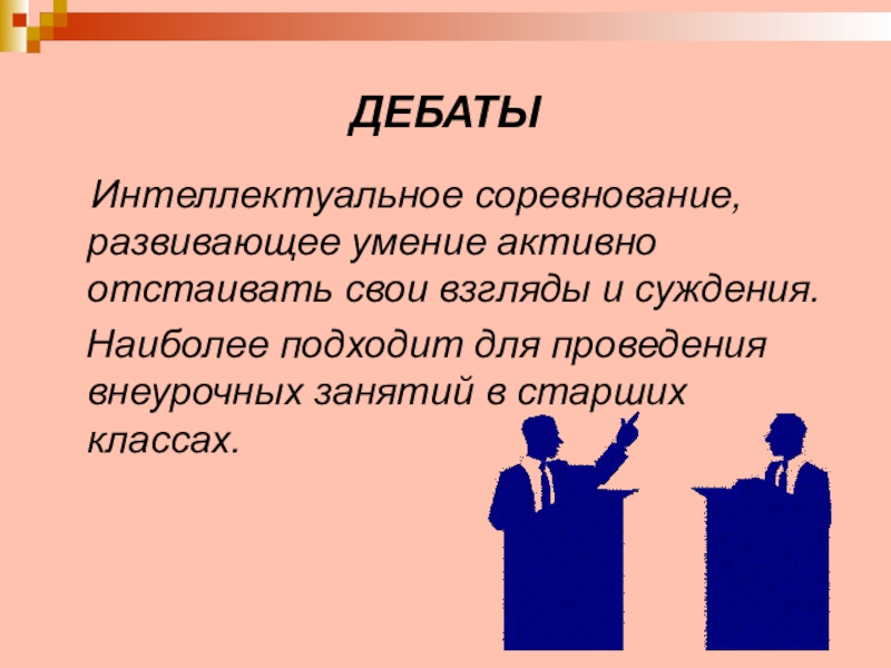 ДЕБАТЫ  Интеллектуальное соревнование, развивающее умение активно отстаивать свои взгляды и суждения.  Наиболее подходит для проведения