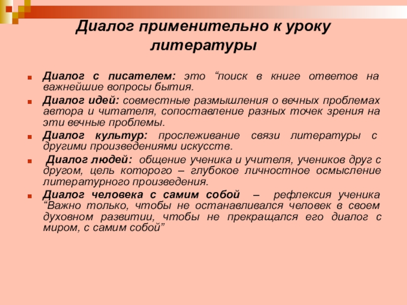 Диалог людей: общение ученика и учителя, учеников друг с другом, цель которого – глубокое личностное осмысление литературного произведения.