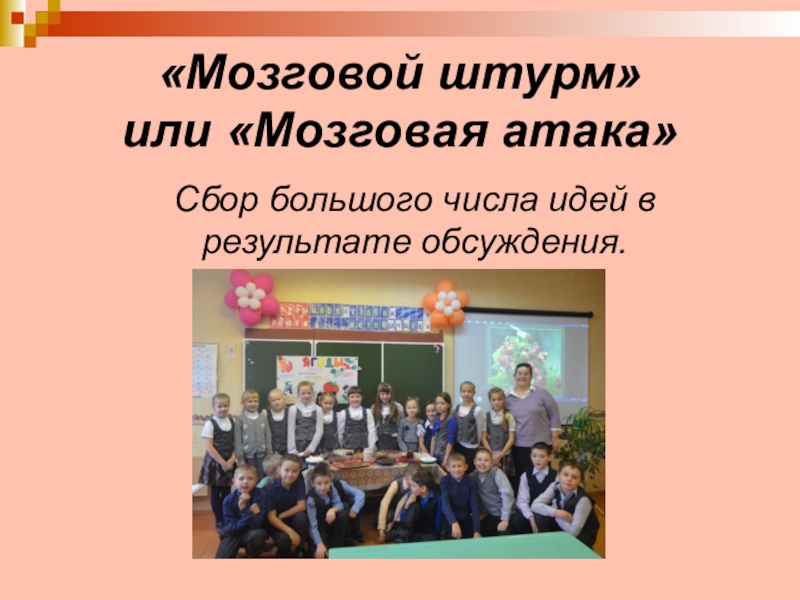 «Мозговой штурм»  или «Мозговая атака»  Сбор большого числа идей в результате обсуждения.