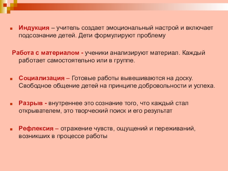 Индукция – учитель создает эмоциональный настрой и включает подсознание детей. Дети формулируют проблему Работа с материалом -