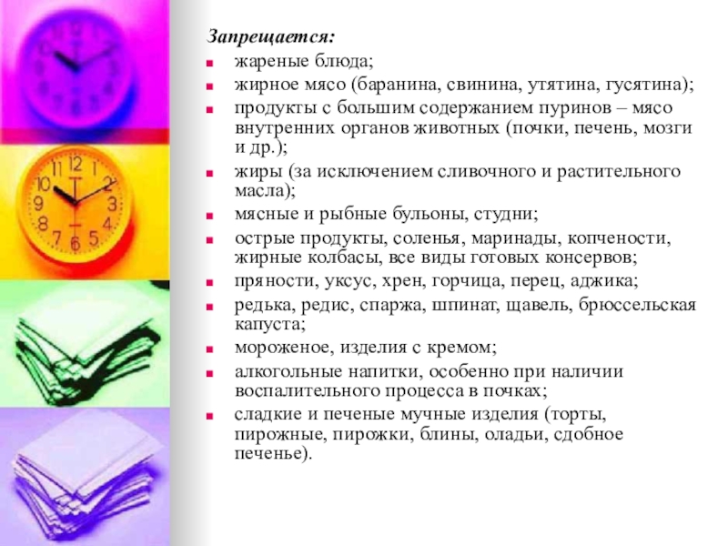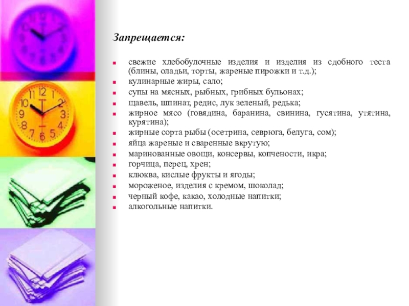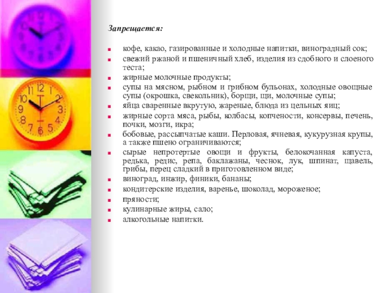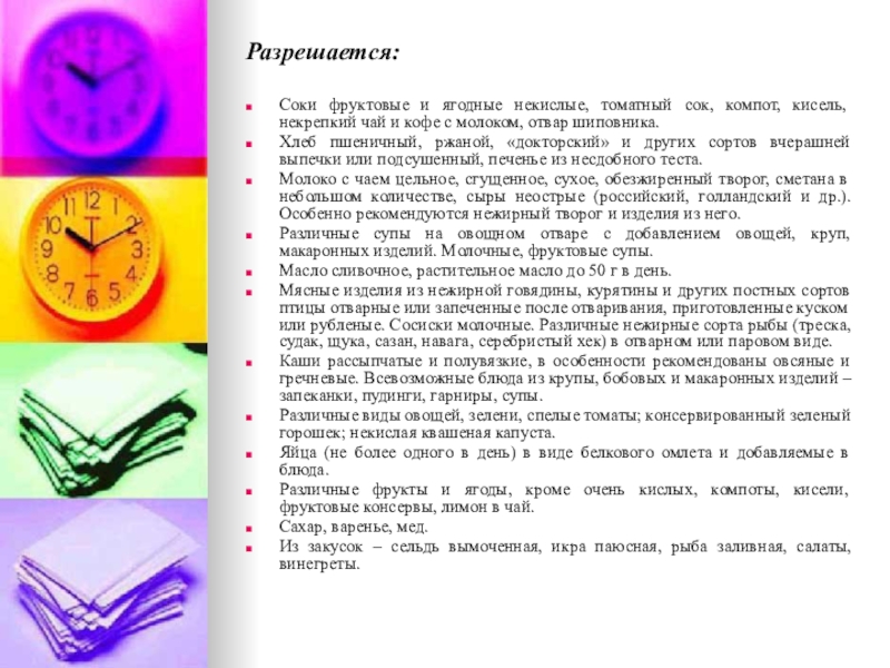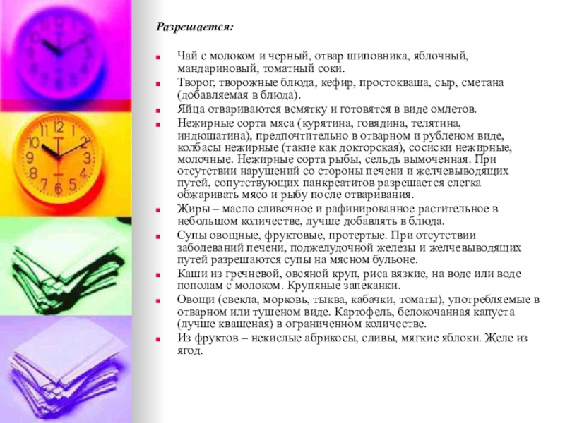 жиров и поваренной соли, механических и химических раздражителей слизистой оболочки и рецепторного аппарата ЖКТ. Исключаются продукты и блюда, усиливающие процессы брожения и гниения в кишечнике, а также сильные стимуляторы желчеотделения, секреции желудка, поджелудочной железы, вещества, раздражающие печень (экстрактивные вещества, органические кислоты, продукты, богатые эфирными маслами, жареные блюда, содержащие продукты неполного расщепления жира, тугоплавкие жиры, продукты, богатые холестерином, пуринами).