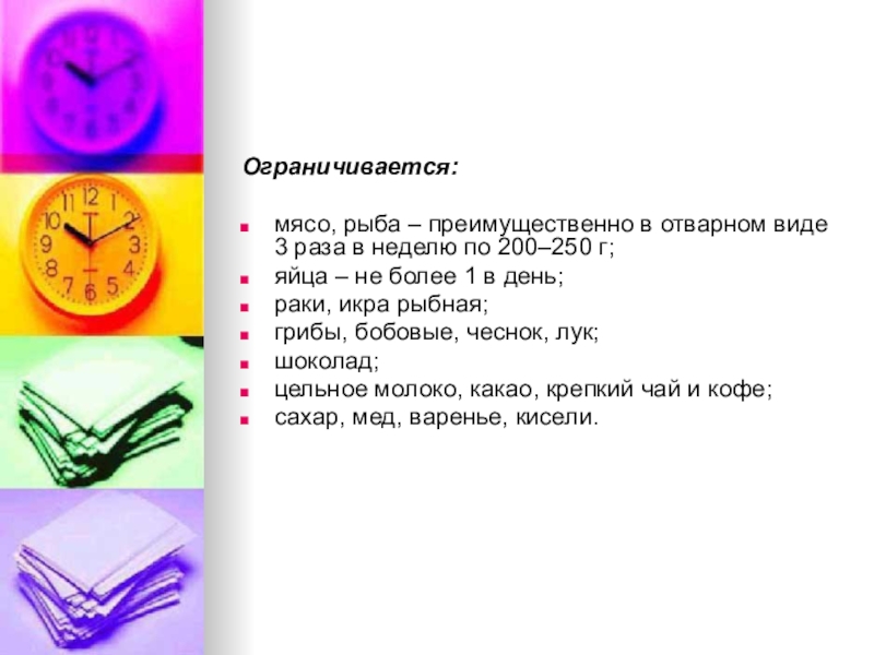 происхождения), резкое ограничение жиров и углеводов. Исключаются продукты, вызывающие вздутие кишечника, содержащие грубую клетчатку, богатые экстрактивными веществами, стимулирующие секрецию пищеварительных соков.