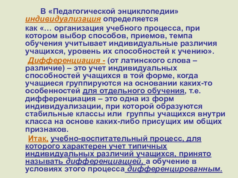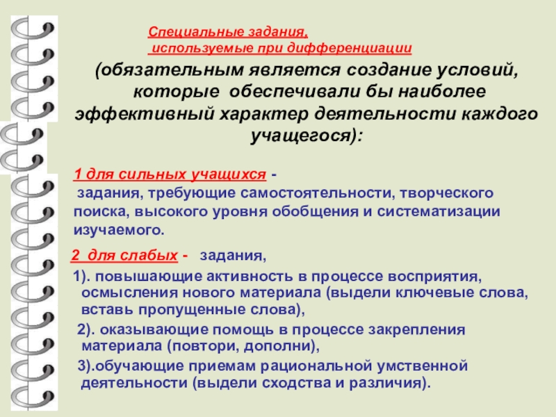 Для осуществления дифференциации деятельность учителя направлена на: