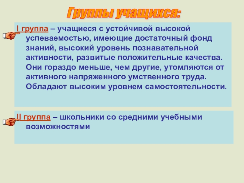 - выделение трех основных групп учащихся:
