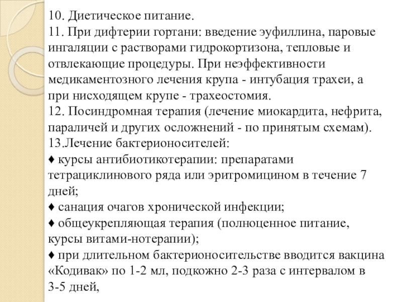 12. Посиндромная терапия (лечение миокардита, нефрита, параличей и других осложнений - по принятым схемам).