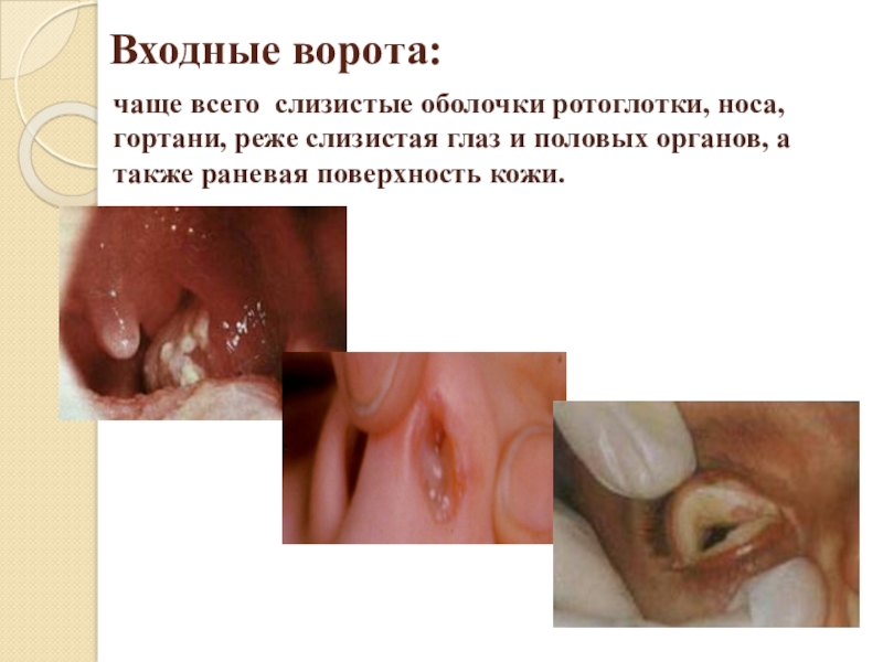 чаще всего слизистые оболочки ротоглотки, носа, гортани, реже слизистая глаз