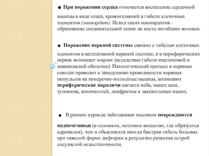 . В раннем периоде заболевания токсином повреждаются надпочечники (в основном, мозговое вещество, где образуется адреналин), чем и объясняется иногда быстрая гибель больных при тяжелой форме дифтерии в результате развития острой сосудистой недостаточности.