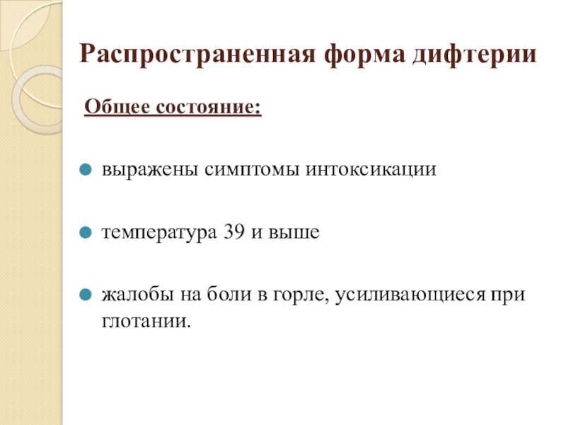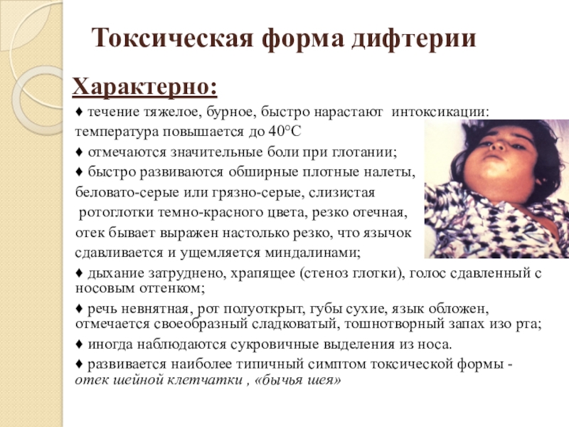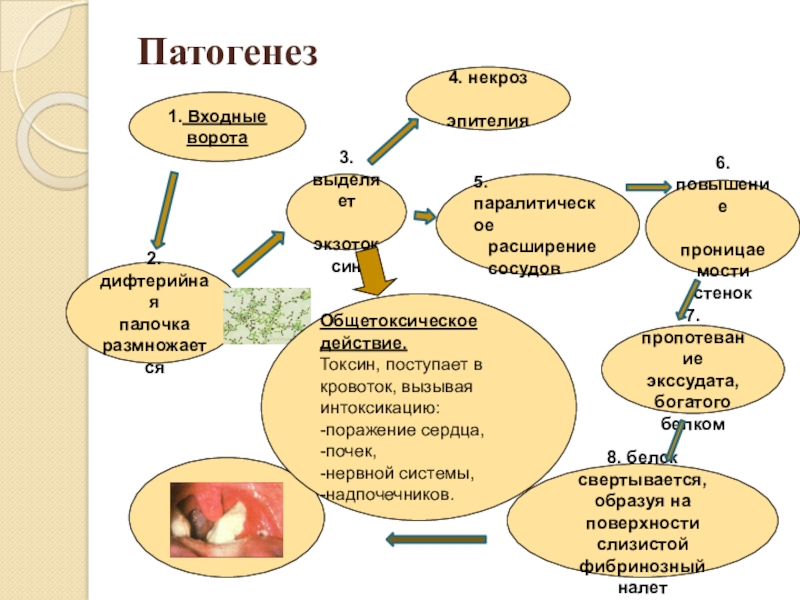с образованием фибринозной пленки и явлениями общей интоксикации в результате действия экзотоксина.