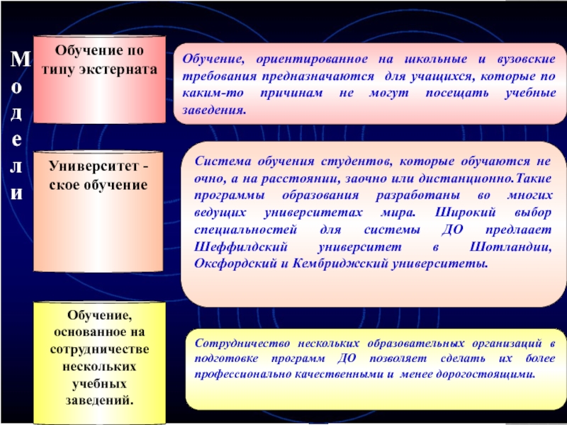 Обучение, ориентированное на школьные и вузовские требования предназначаются для учащихся, которые по каким-то причинам не могут посещать учебные заведения.