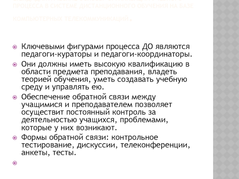 Формы обратной связи: контрольное тестирование, дискуссии, телеконференции, анкеты, тесты.
